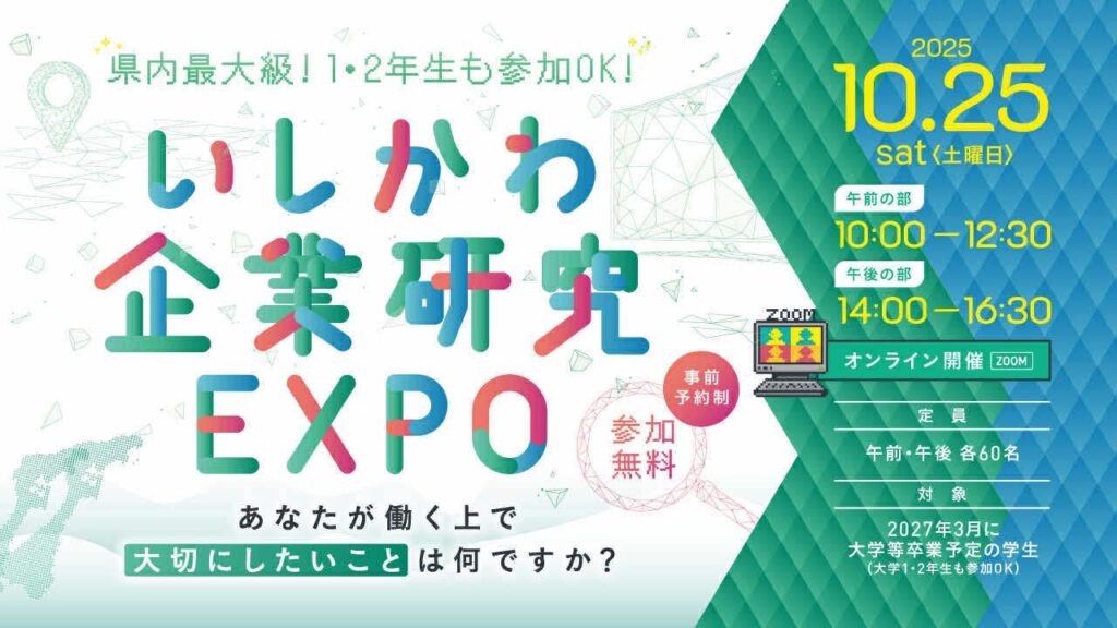2025.10.17 いしかわ企業研究EXPO 10月25日(土)午前の部に参加いたします。皆さまの参加をお待ちしております。 長寿メディカル株式会社は介護に関係する会社ですが、介護以外の話題も大歓迎です!皆さまのお話を聞かせてください😀 前の記事 │ 2025.10.17 │ 次の記事