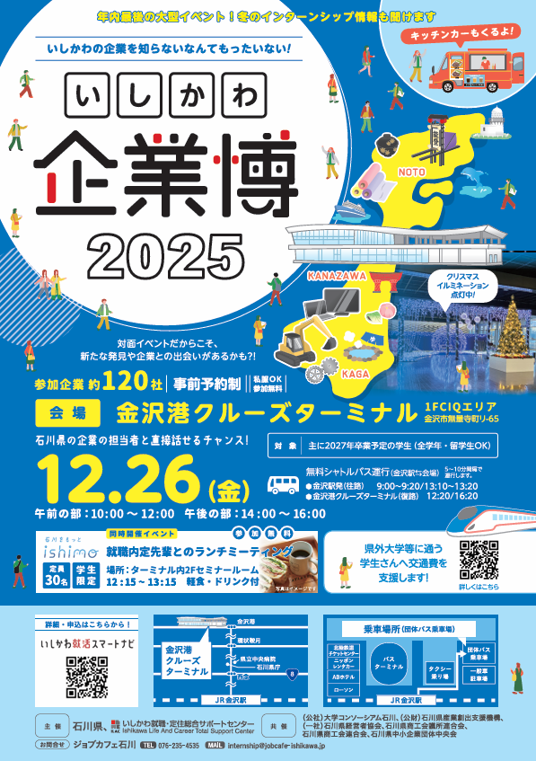 2025.12.11 いしかわ企業博 12月26日開催の『いしかわ企業博』午後の部に当社も参加します。若手社員の生の声や、キャリア形成の具体例をお伝えしますので、ぜひブースへお越しください。 前の記事 │ 2025.12.11 │